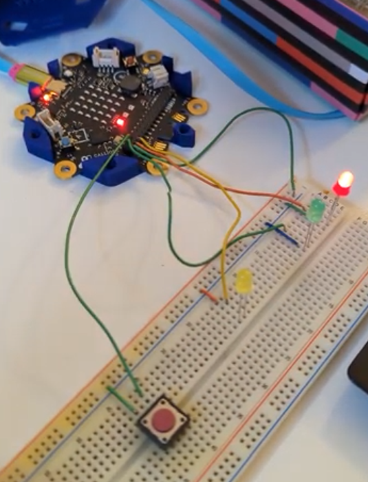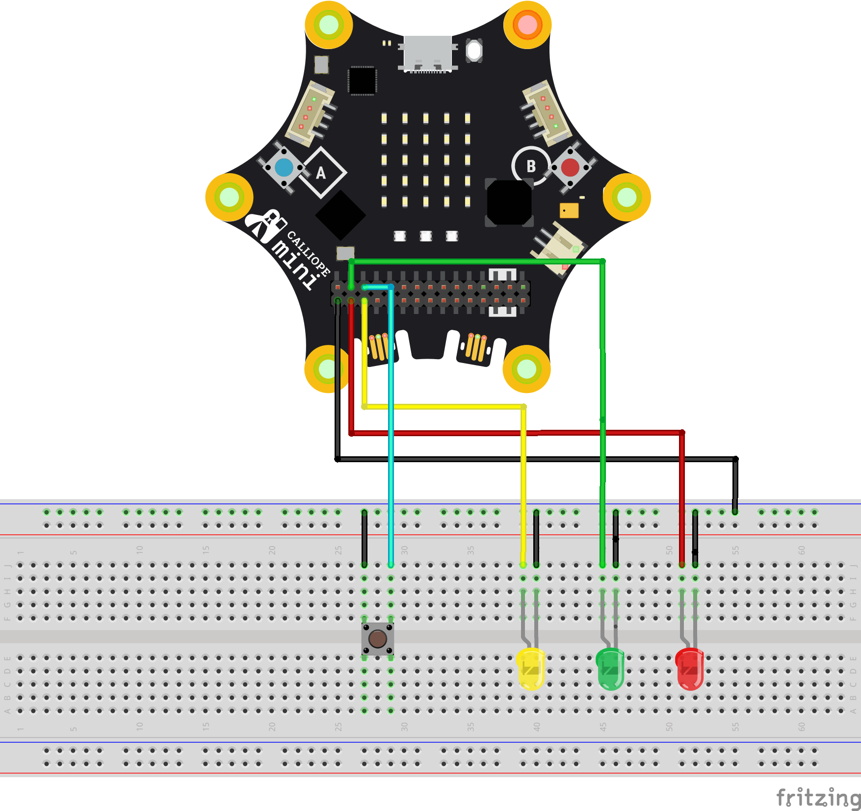 Mit diesem Quellcode kann eine Ampelsteuerung mit Hilfe eines Calliope Mini v3 simuliert werden. Für die Fahrzeugampel kommen die 3 LED des Calliope selbst zum Einsatz, die Fussgängerampel wird durch externe LED simuliert. Die gelbe LED bei der Fussgängerampel steht für die ‘Signal kommt’-Anzeige.